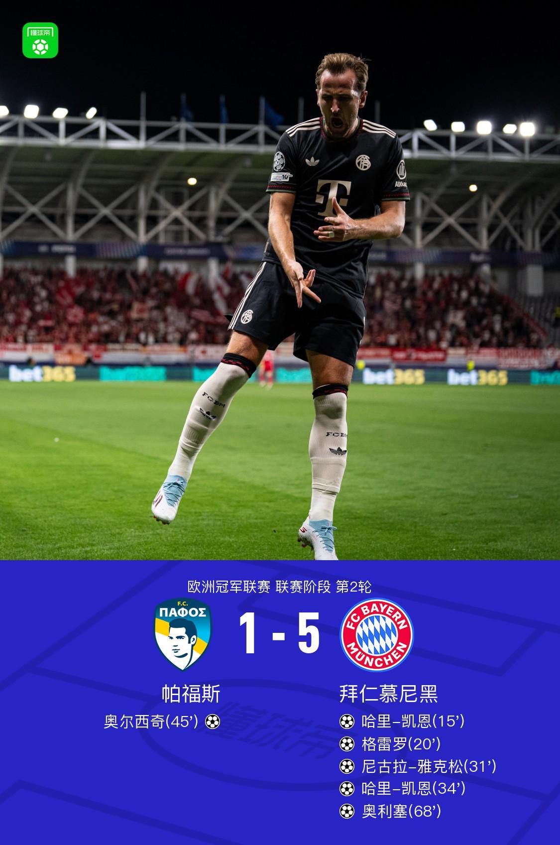 北京时间10月1日凌晨,2025/26赛季欧洲冠军联赛联赛阶段第2轮展开激烈争夺,德甲豪门拜仁慕尼黑客场挑战塞浦路斯球队帕福斯。最终凭借凯恩的梅开二度、奥利塞的一射两传以及雅克松的传射建功,拜仁以5-1的压倒性优势取得胜利。