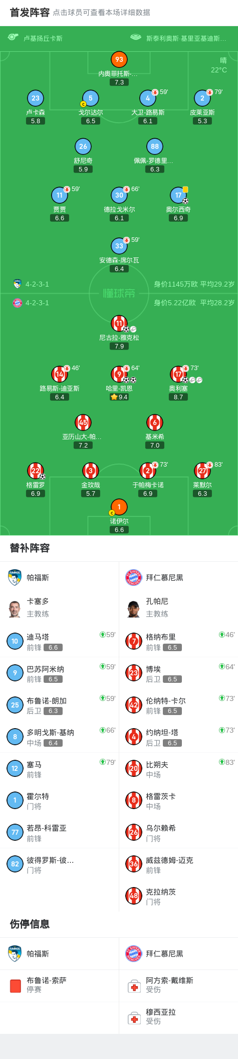 比赛第15分钟,奥利塞在右路送出精准直塞,凯恩禁区内低射破门,拜仁1-0领先。第21分钟,雅克松中场做球,格雷罗插上推射得手,比分扩大为2-0。