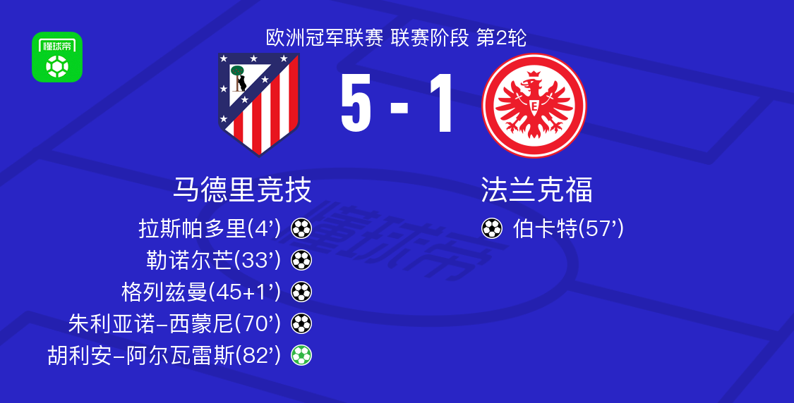 易边再战,法兰克福在第57分钟由克瑙夫助攻伯卡特扳回一城(3-1)。但马竞迅速做出回应:第70分钟,阿尔瓦雷斯再次送出妙传,朱利亚诺-西蒙尼冷静推射破门;第82分钟,阿根廷前锋亲自主罚点球命中,将最终比分定格为5-1。