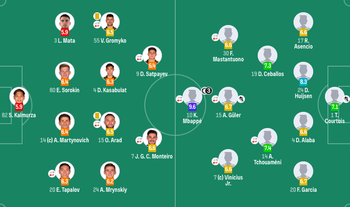 尽管取得大胜,但皇马仍有遗憾。第13分钟,维尼修斯获得准单刀机会,但其挑射偏出球门。第58分钟,维尼修斯横传姆巴佩,后者面对门将竟将球打偏。阿拉木图方面,第68分钟葛罗米柯禁区内倒地,裁判经VAR确认后未判罚点球。
