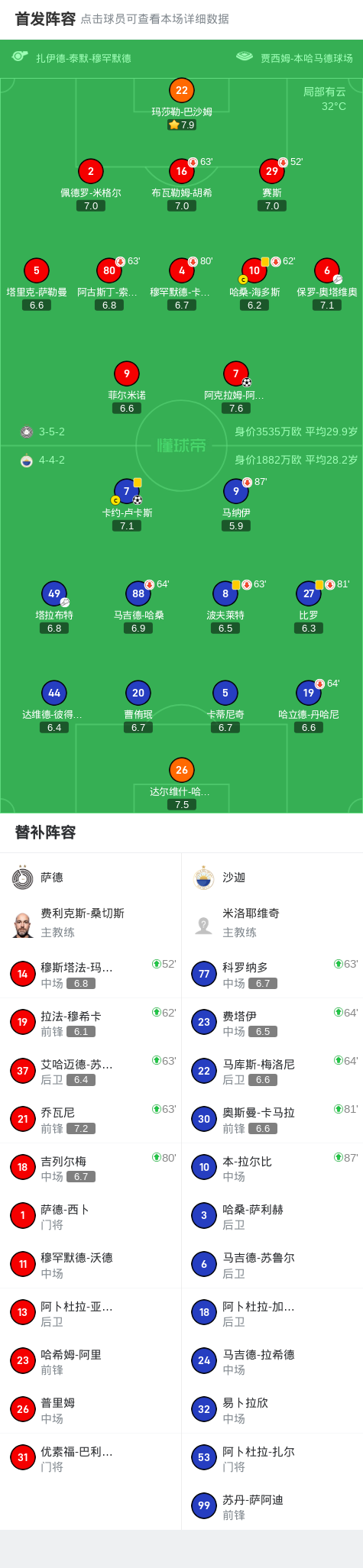 萨德排出4-3-3阵型,阿克拉姆-阿菲夫与布奈贾组成锋线双煞,中场由哈桑-海多斯坐镇。沙迦则以4-2-3-1应战,卡约-卢卡斯担任前腰,塔拉布特与阿尔哈马迪组成双后腰。比赛中双方多次进行人员调整,萨德第65分钟换上阿尔哈伊多斯加强进攻,沙迦则在第78分钟派上帕科冲击防线。