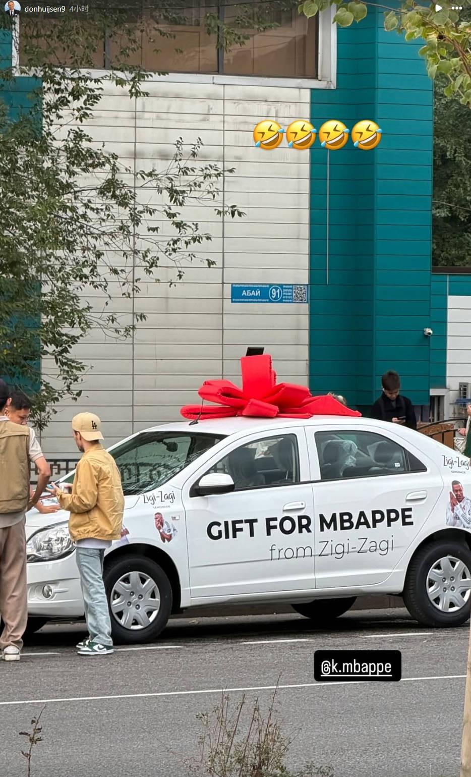 从唐尼-赫伊森发布的照片中,我们可以清晰地看到,这台被精心包装的汽车上不仅覆盖了精美的礼物包装纸,还印有姆巴佩的多张照片,以及一句温馨的话语:“送给姆巴佩的礼物,来自Zigi-Zagi”。这一举动无疑展现了阿拉木图球迷对姆巴佩的极大热情和喜爱。