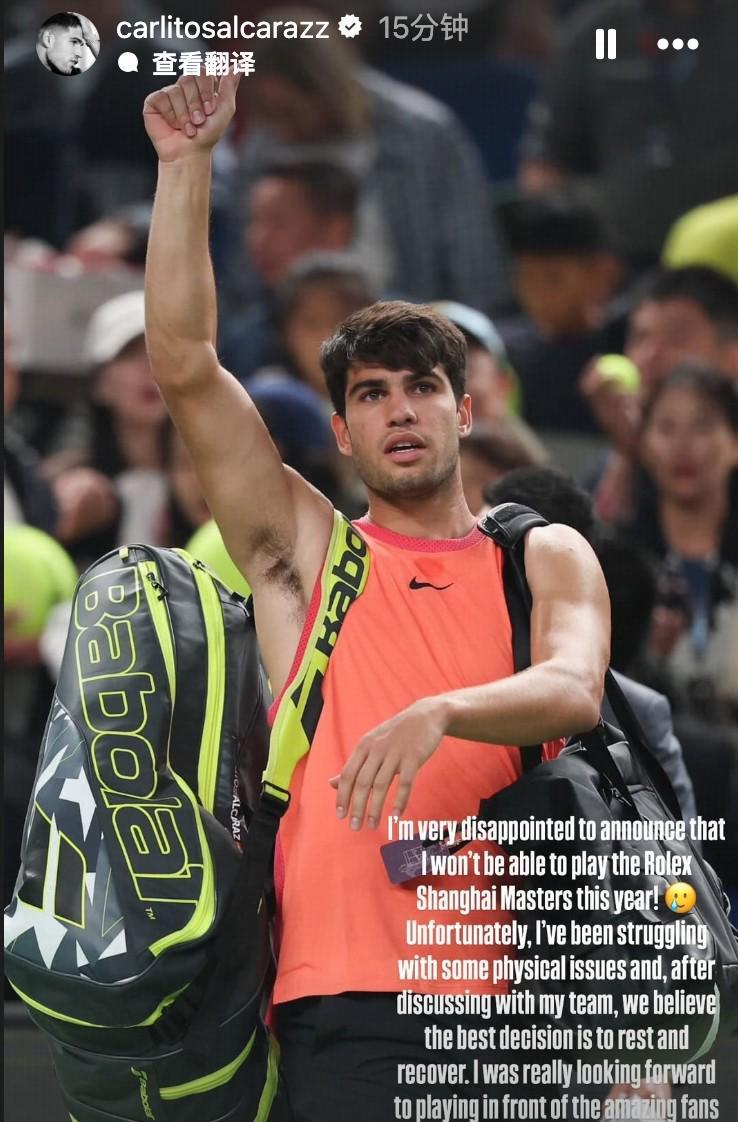阿尔卡拉斯在声明中表示:"我非常遗憾地宣布,今年将无法参加劳力士上海大师赛。近期我一直受到伤病困扰,经过与医疗团队和教练组的充分讨论,我们认为现阶段最合理的选择是暂停比赛,专注于身体恢复。我原本非常期待能再次在上海热情的球迷面前献技,也感谢大家一直以来的支持,希望尽快重返赛场,明年与中国球迷重逢!"