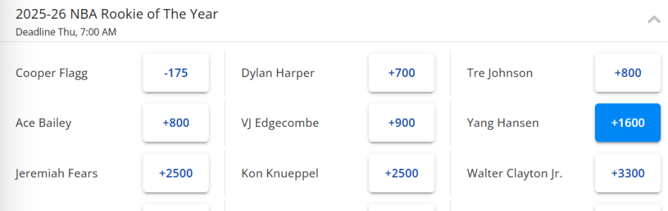 杨瀚森的赔率排名可谓一路高歌猛进。选秀大会结束后,他以+25000的赔率并列第27位,一周后跃升至第15位,夏季联赛后更飙升至第8位。如今,他连续超越4号秀克努佩尔和7号秀费尔斯,稳居第6位,成为最受关注的新秀之一。