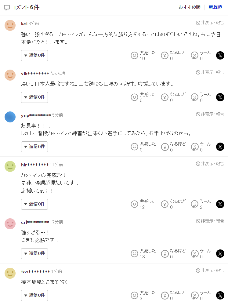 赛后,日本球迷纷纷在社交媒体上表达了对桥本帆乃香的赞叹之情。有球迷表示:“桥本选手的表现太强了,简直就像理发师一样,直接给对手剃了个光头,她绝对是日本最强的选手!”还有球迷预测:“下一场对阵王艺迪,桥本选手可能也会以压倒性的优势取胜。”