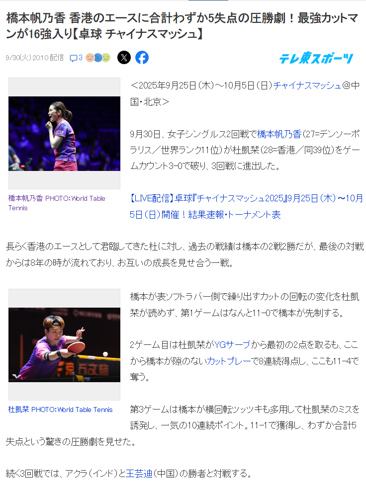 值得一提的是,9月7日桥本帆乃香在WTT阿拉木图站夺得女双、女单两个冠军后,日本媒体就曾发文询问,除了世界排名第一、第二的孙颖莎和王曼昱外,还有谁能战胜桥本帆乃香。因为到目前为止,桥本帆乃香仅输给过这两位国乒选手,其余国乒选手多次败在她手下,比如王艺迪就已经输过三次。