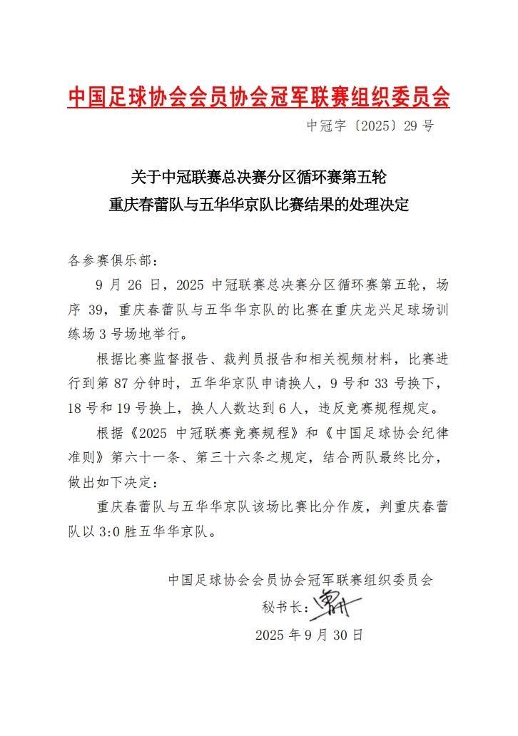 北京时间9月30日,中冠组织委员会正式发布公告,确认五华华京队在与重庆春蕾的比赛中因换人人数严重违规,被判罚0-3负。这场原本以3-1领先的比赛,因球队的业余操作痛失三分,引发广泛关注。