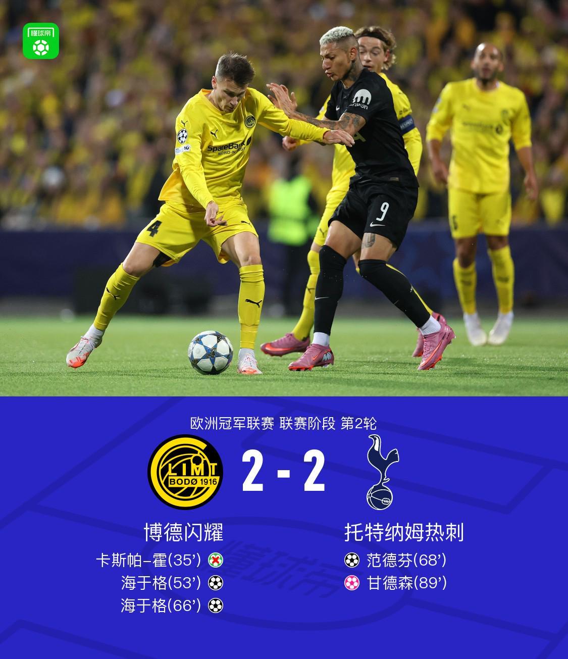 北京时间10月1日,在欧洲冠军联赛第2轮的激烈对决中,托特纳姆热刺客场挑战博德闪耀,最终双方以2-2的比分握手言和。本场比赛,海于格表现抢眼,独中两元成为博德闪耀的功臣,而热刺方面,范德芬的头球破门以及甘德森的乌龙球,则为比赛增添了诸多看点。
