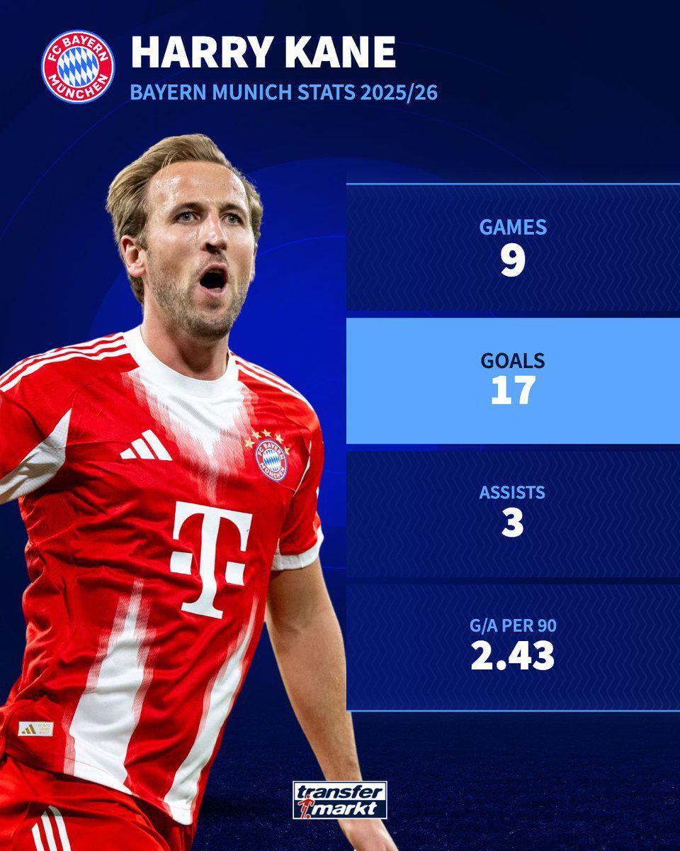 至此,凯恩在本赛季代表拜仁慕尼黑的各项赛事中已经出场9次,直接参与了20个进球,其中包括17个进球和3次助攻。这样的数据无疑证明了凯恩在进攻端的强大实力和高效表现。