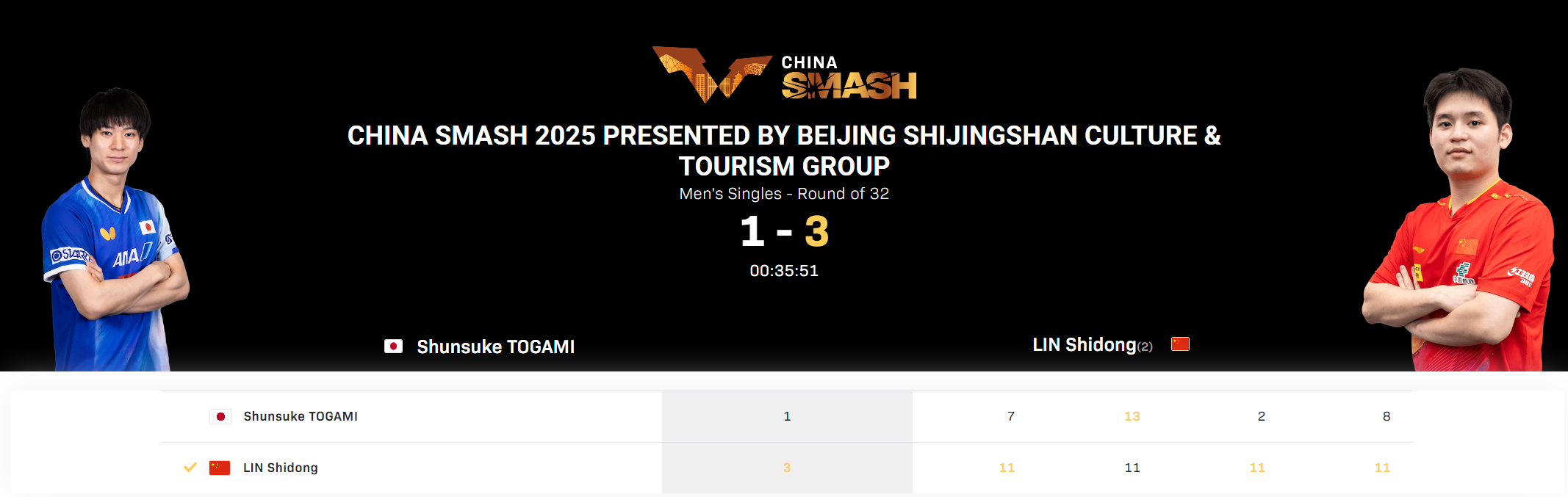 北京时间9月30日晚,WTT北京大满贯男单1/16决赛迎来一场焦点对决,国乒新星林诗栋与日乒悍将户上隼辅展开激烈交锋。最终,林诗栋以3-1的总比分力克对手,四局比分分别为:11-7,11-13,11-2,11-8。这场比赛,林诗栋展现出了极高的竞技水平,尤其是决胜局的赛点球,更是让全场球迷沸腾,直播间解说员也激动地高呼“超级球”!