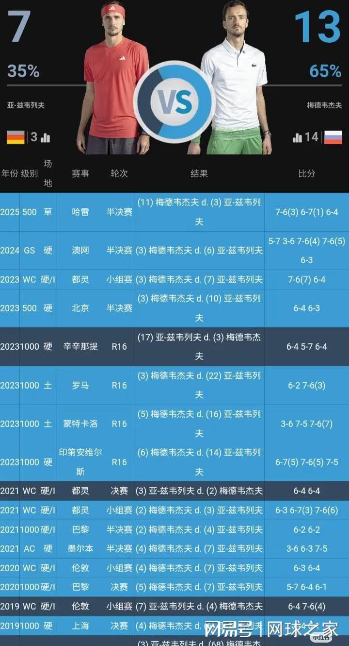 来年,两人依旧在大赛中频繁碰面。这一年下半年,梅总开始崭露头角,实力迅速崛起。在上海大师赛上,他成功击败兹维列夫,赢得了个人首个大师赛冠军,这无疑是他职业生涯的一个重要里程碑。然而,在年底的年终总决赛中,前赛会冠军兹维列夫展开反击,成功击败首次入围的梅总,报了一箭之仇。