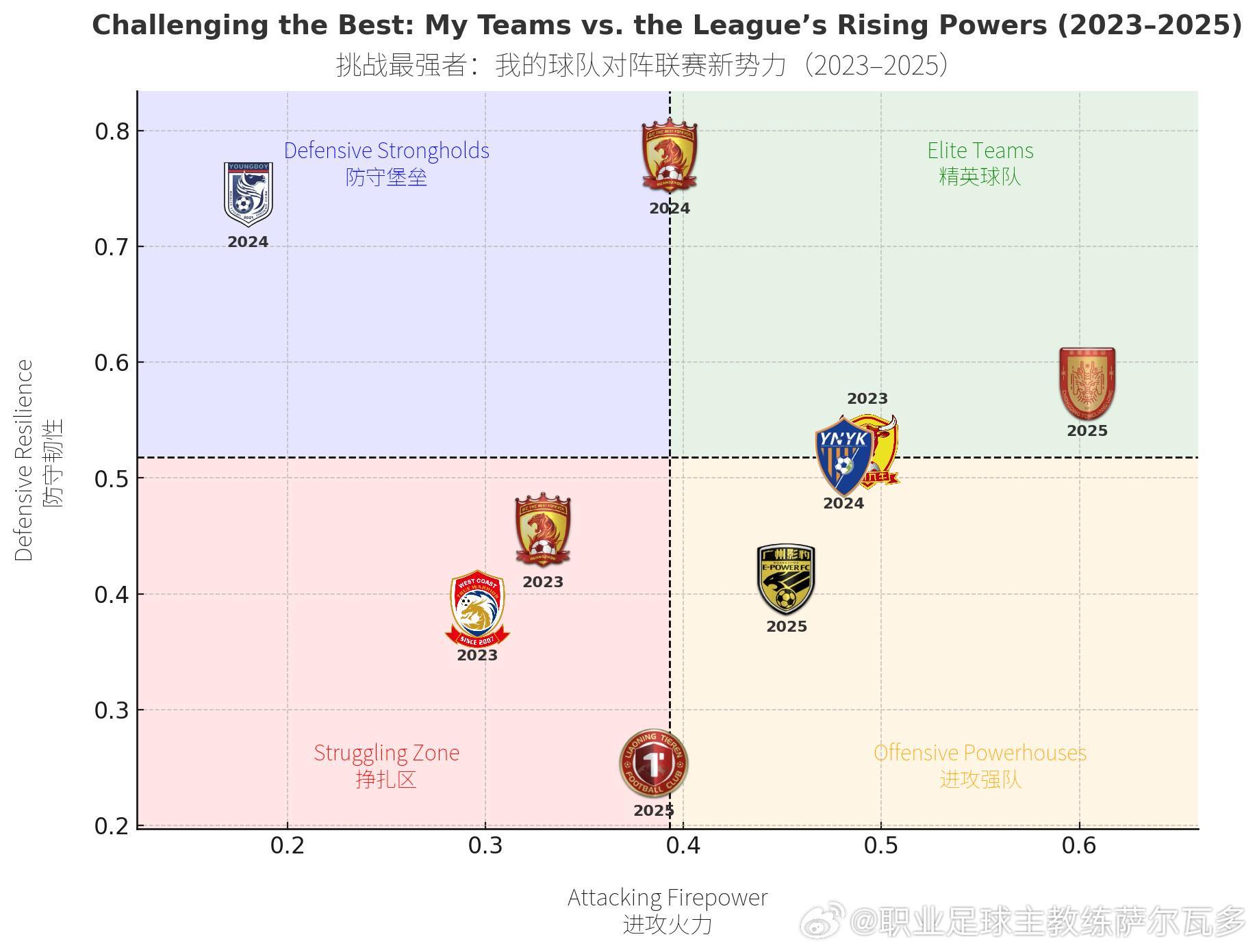 为了更直观地展示这一点,我想分享一张图表。这张图表比较了我在中国中甲联赛(2023、2024、2025)执教的球队与升班马以及联赛领先球队的表现。图表通过力量平衡的方式呈现,X轴代表进攻火力,Y轴代表防守韧性。