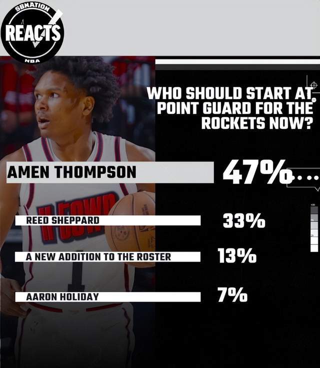 不久前,一项美国媒体的小调查显示,有47%的火箭球迷支持让阿门打控卫,而支持谢泼德的球迷只有33%,支持小霍乐迪的球迷更是仅有7%。这无疑反映了球迷们对阿门和谢泼德的期待。