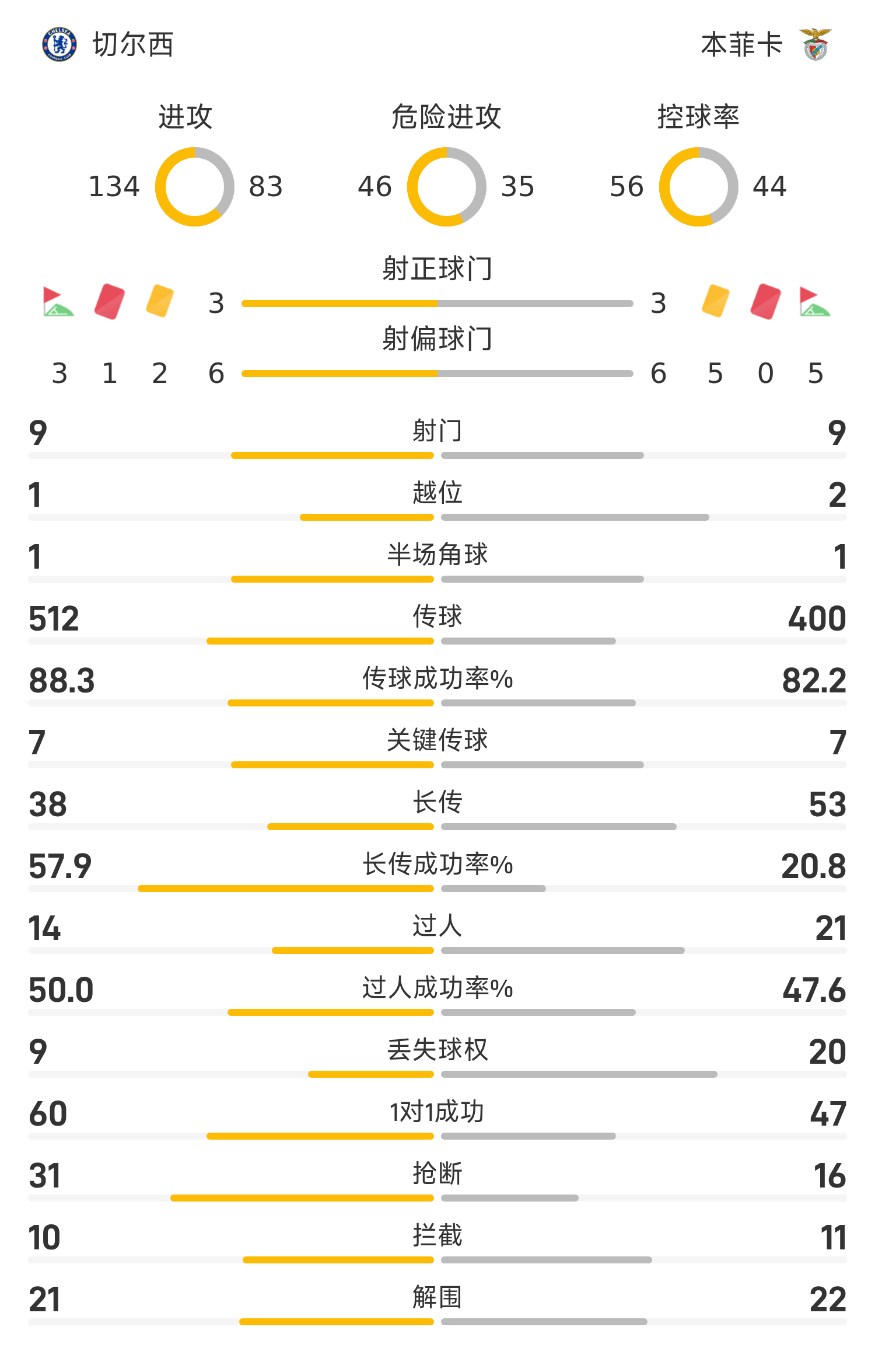 本场比赛,双方在进攻端的表现可谓势均力敌。从射门数据来看,切尔西与本菲卡均完成了9次射门,射正数也均为3次,展现出了不相上下的进攻火力。然而,在控球率方面,切尔西以56%对44%的优势占据上风,这为他们的胜利奠定了坚实的基础。