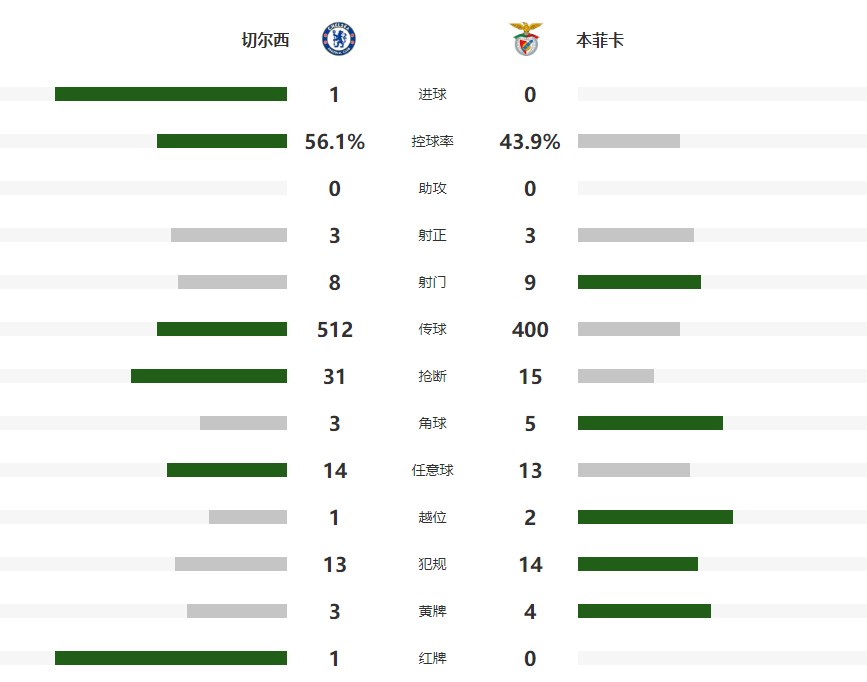 第18分钟,加纳乔在禁区左侧不停球传中,皮球被里奥斯挡入自家大门,切尔西1-0领先。半场结束前,随队远征的本菲卡球迷对裁判判罚不满,穆里尼奥及时安抚球迷情绪,赢得斯坦福桥掌声。