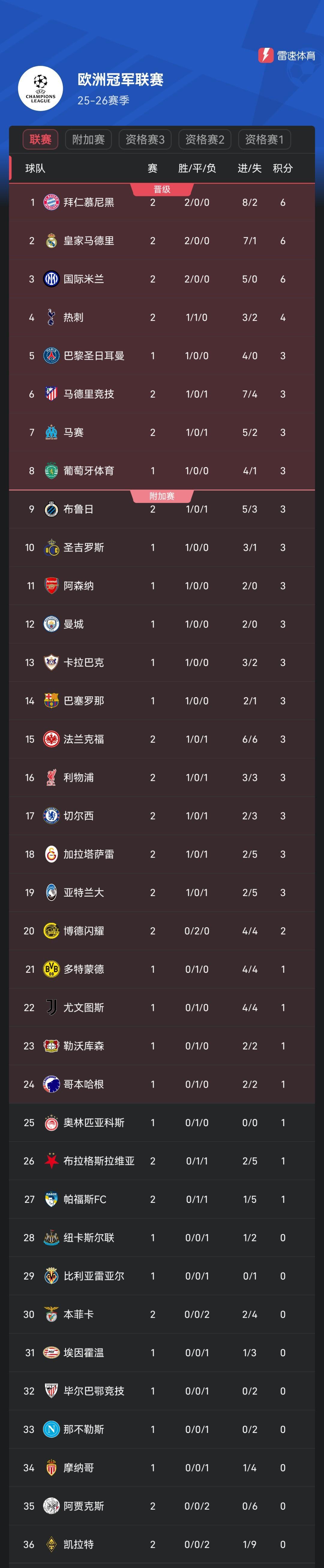 在最新积分榜上,拜仁、皇马、国际米兰均以两战全胜积6分的成绩位列第一集团。其中,拜仁凭借净胜球优势暂时领跑积分榜,展现出强大的进攻火力。皇马同样状态火热,5-0大胜凯拉特后稳居前列。国际米兰则以3-0完胜布拉格斯拉维亚,延续了新赛季的出色表现。
