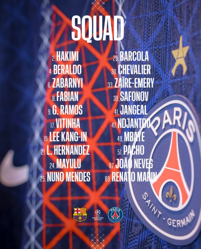 巴黎圣日耳曼对阵巴萨大名单详情: