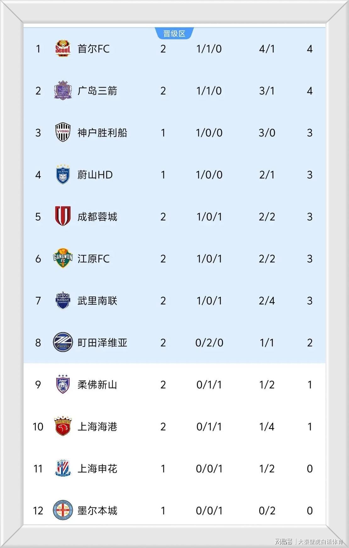 排名榜首的是首尔FC,2战1胜1负积4分,排名第二的是广岛三箭,同样积4分;