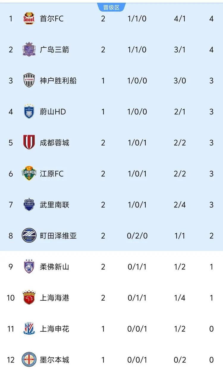 在目前的积分榜上,首尔FC和广岛三箭同积4分位列前两位,而今晚赢球的成都蓉城则排名第五,展现出了不俗的竞争力。然而,有人欢喜有人忧,上海海港则被挤出前八,以两战积一分的战绩排在第十,暂时无缘晋级区。对于海港来说,接下来的比赛将更加艰难,他们需要尽快调整状态,争取在后续的比赛中迎头赶上。
