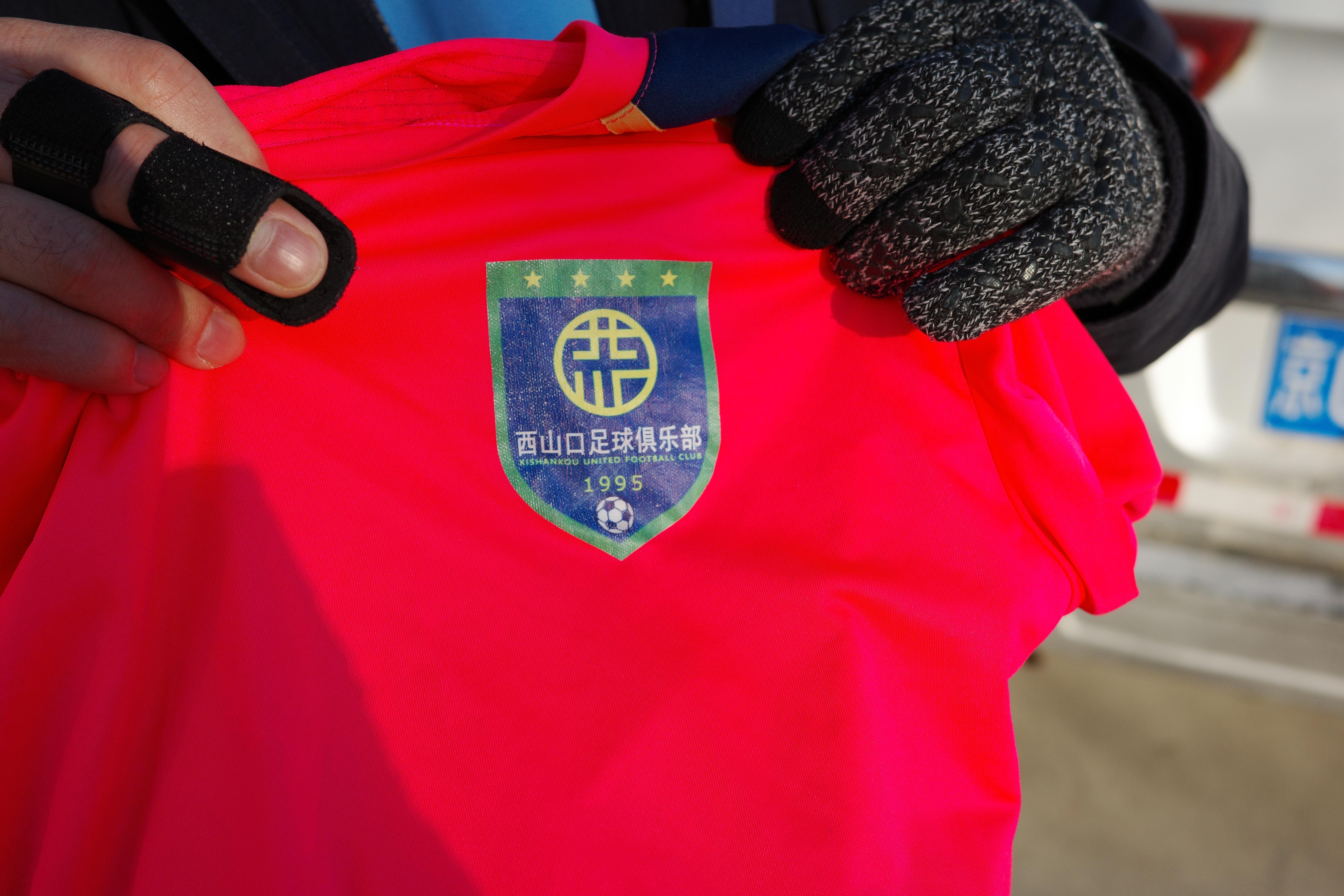 村里踢球的人越来越多,到1995年,西山口村自发成立了自己的足球队。那年,年轻小伙儿张志强为队伍设计了专属队标:圆圈之中,“西山口”三个字巧妙地包含其中。“这个标到现在用了小30年了,最开始这标都没能印在队服上,还是大家伙儿用笔,一笔一画地勾勒在衣服上的。”
