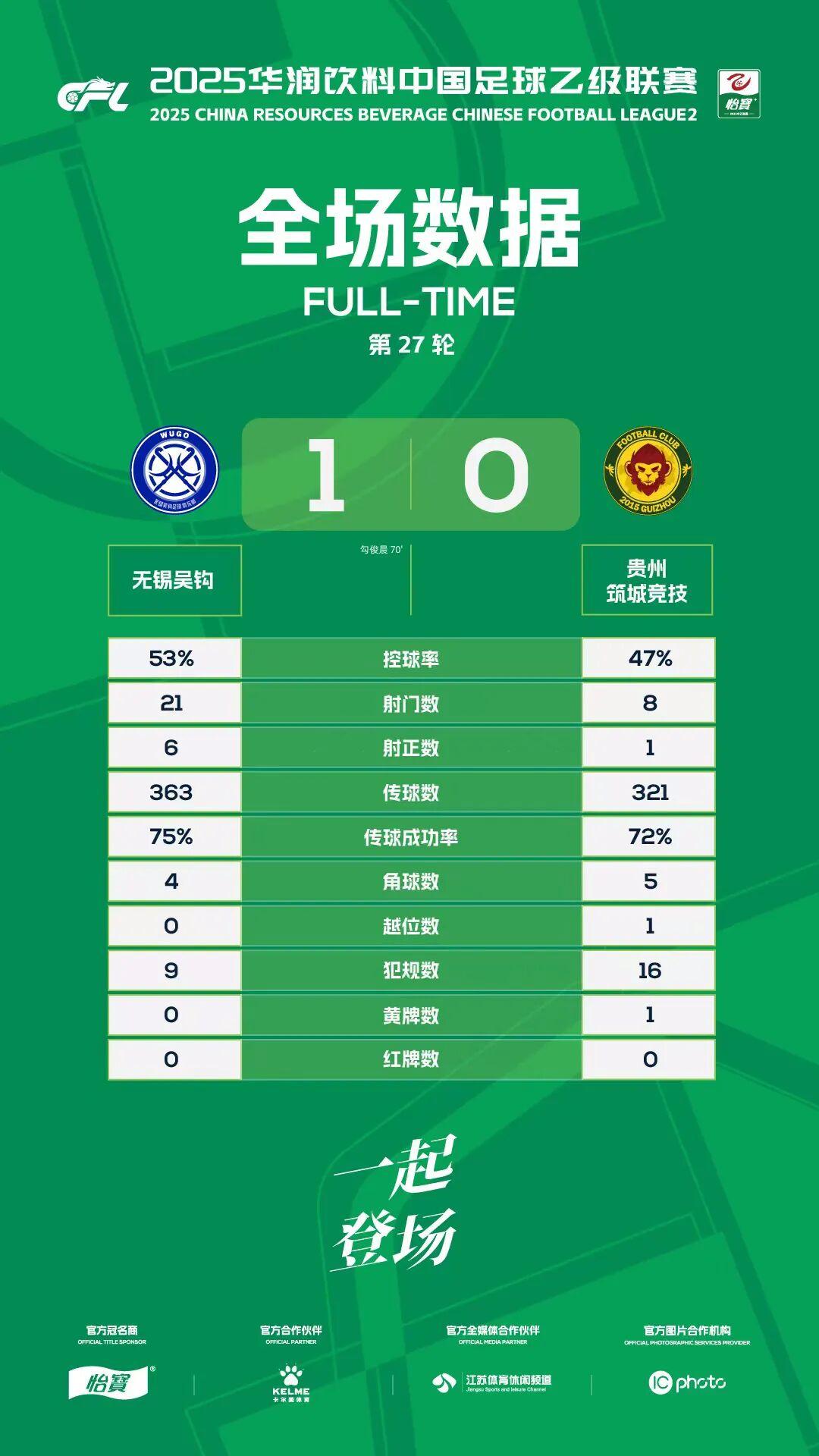 9月29日19:00,2025华润饮料中乙联赛第27轮第四比赛日,无锡吴钩与贵州筑城竞技的较量在宜兴市体育中心上演。本场比赛,勾俊晨打入全场唯一进球,帮助无锡吴钩以1-0的比分战胜对手。