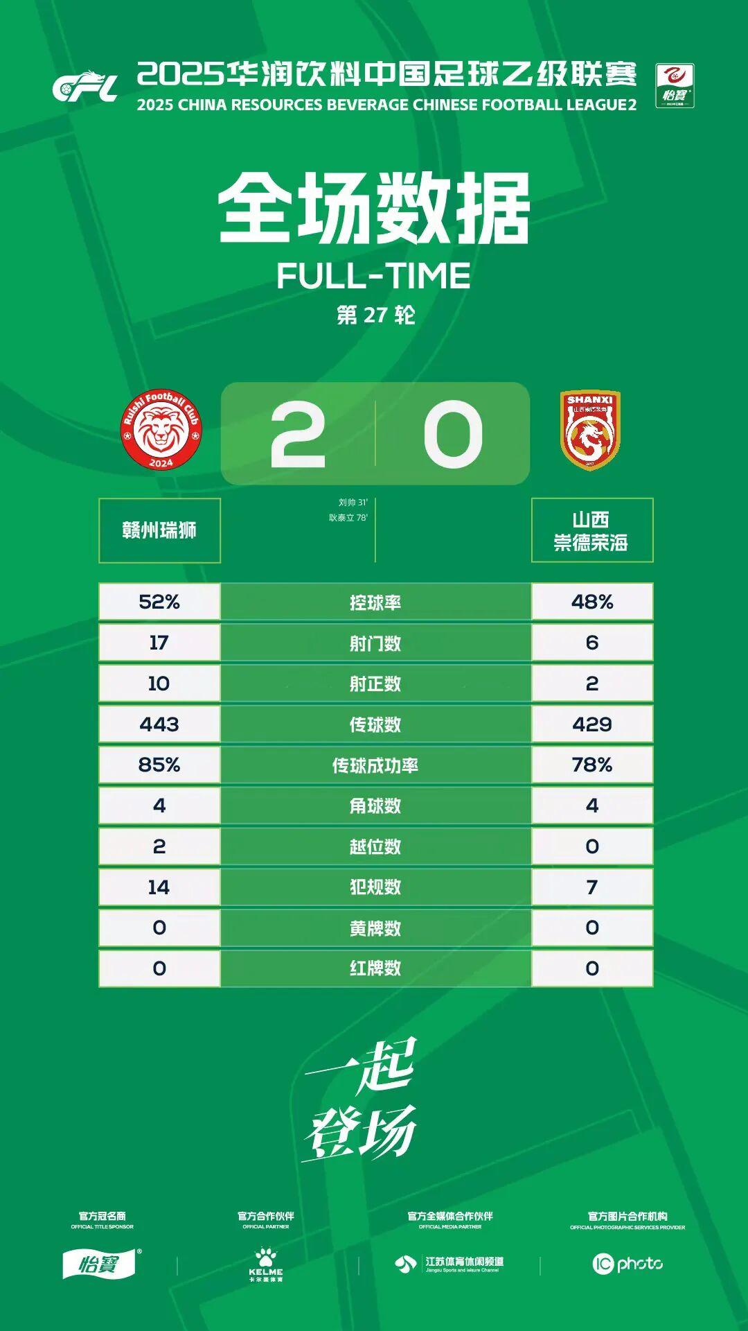 最终,全场比赛结束,赣州瑞狮2-0战胜山西崇德荣海。
