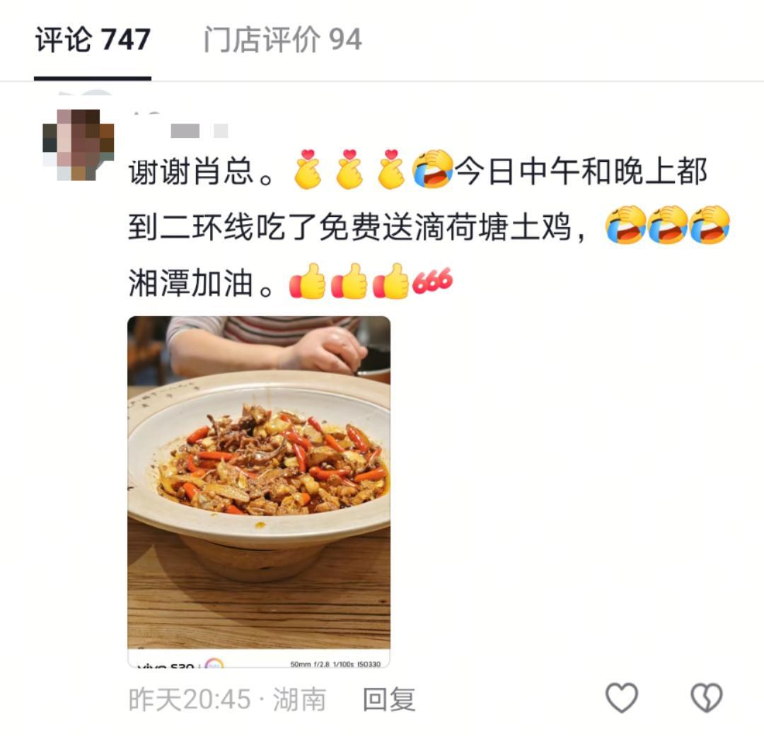 比赛结果虽不尽如人意,但肖亮并未食言。9月29日晚,他通过个人视频账号向广大球迷宣布:“湘潭队输了,没关系!请大家吃鸡!”视频中,众多顾客在餐馆前排起了长队,等待领取这份免费的“安慰奖”。据统计,当晚共送出了约1000份茶油焖鸡,场面十分壮观。