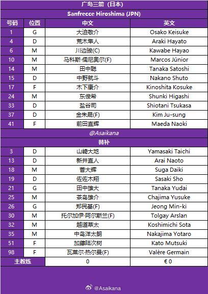广岛三箭首发阵容:门将1号大迫敬介坐镇球门,后防线由4号荒木隼人、15号中野就斗、33号盐谷司和37号金朱晟组成,中场6号川边骏与10号儒尼奥、14号田中聪搭档,24号东俊希和17号木下康介分居两翼,锋线则由41号前田直辉担任。与海港五外援的豪华配置相比,广岛三箭仅派出两名外援首发。