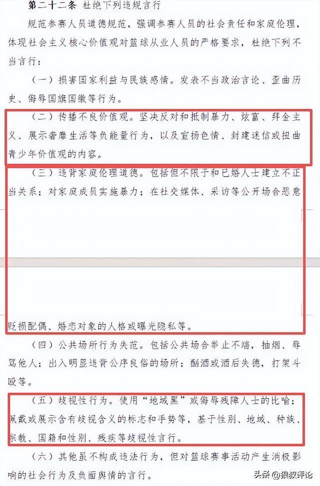 新规强调了参赛人员的道德规范,要求球员承担社会责任,维护家庭伦理,体现社会主义核心价值观对篮球从业人员的严格要求。具体禁止的不当言行包括: