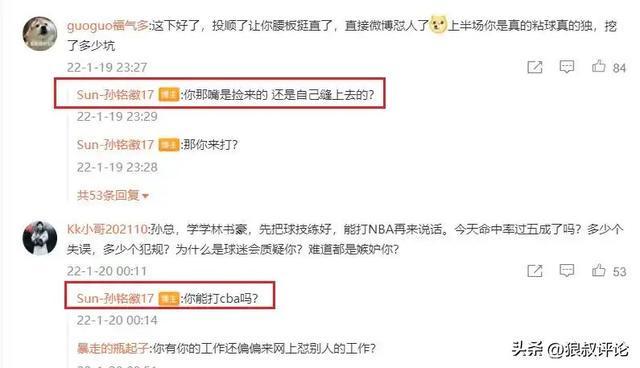广厦球员孙铭徽因表现未达预期,也曾与球迷在网络上进行对线。
