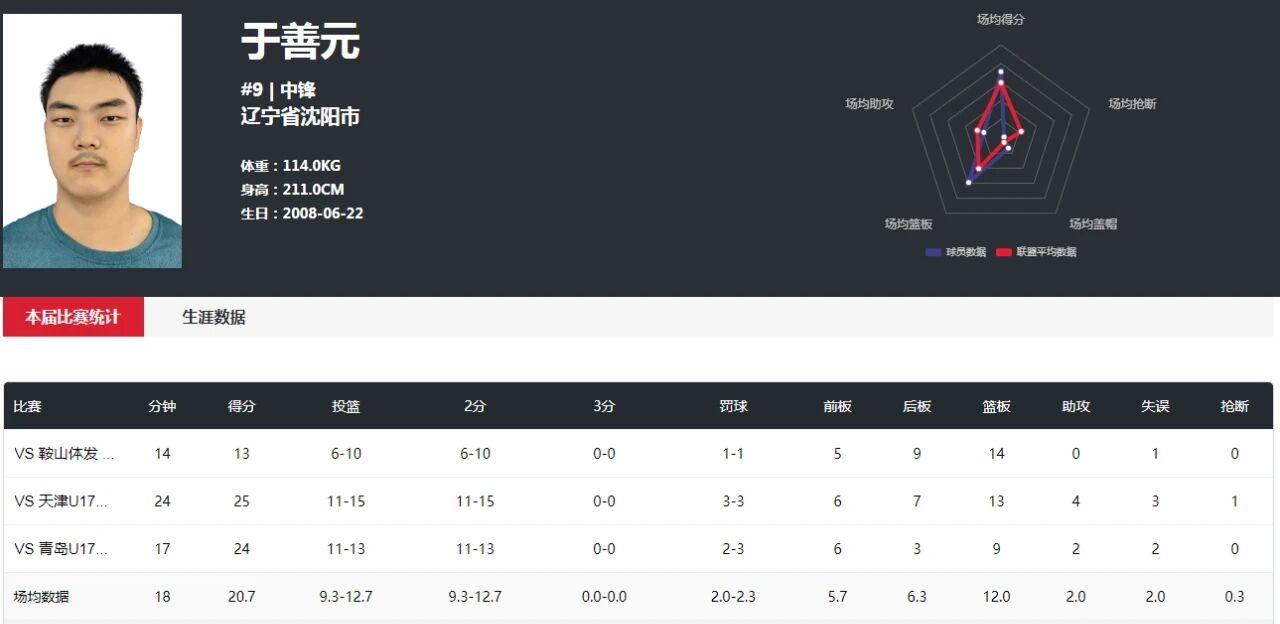 三场比赛下来,于善元场均出战仅18分钟,却能高效贡献20.7分12个篮板2次助攻,无论是进攻还是防守,都展现出了超乎年龄的成熟与稳定。这样的表现,无疑让辽宁球迷对于善元的未来充满了期待。值得一提的是,为了保护这位潜力新星,辽宁U17教练组在比赛中对于善元的使用显得颇为谨慎,否则他的数据可能会更加耀眼。
