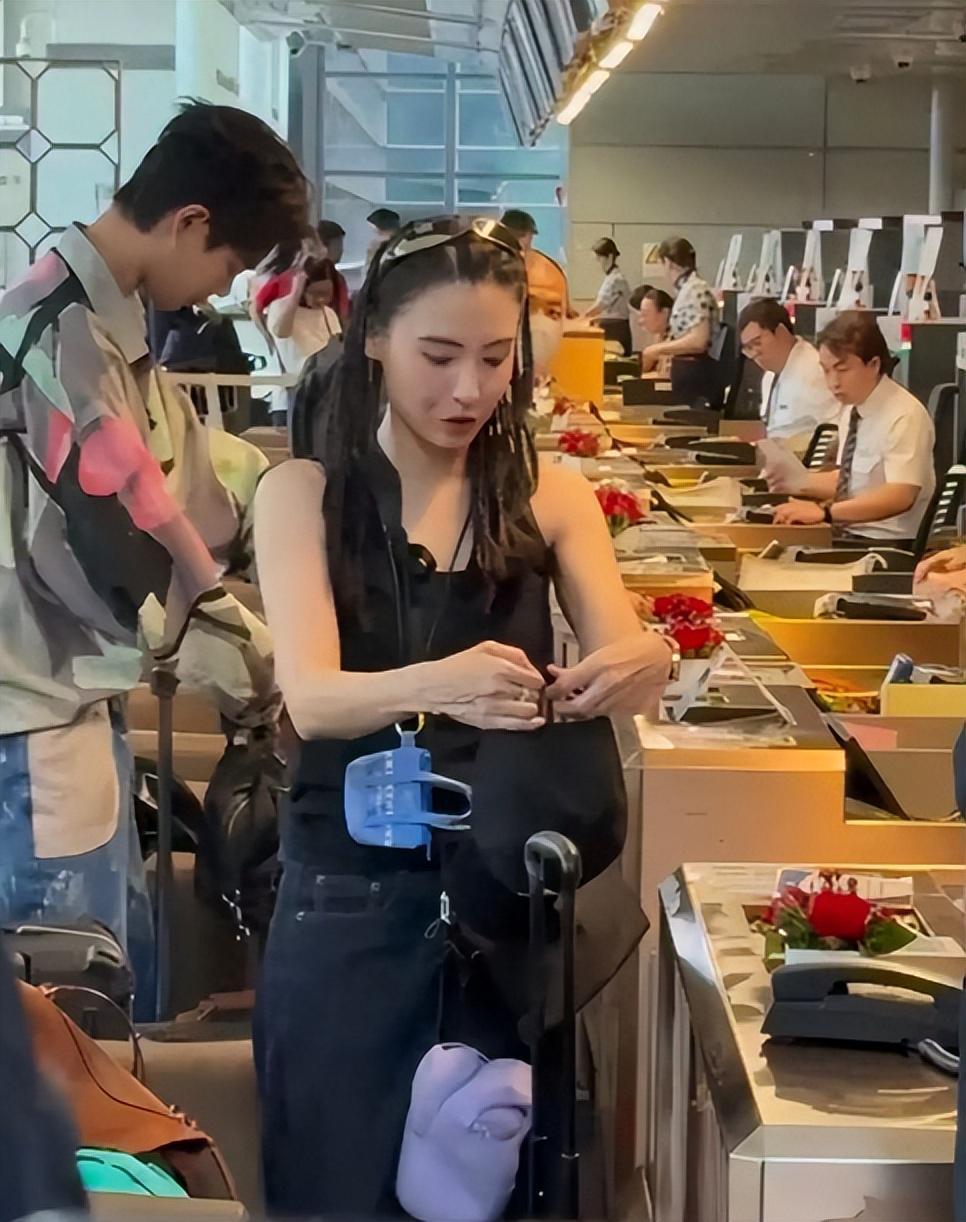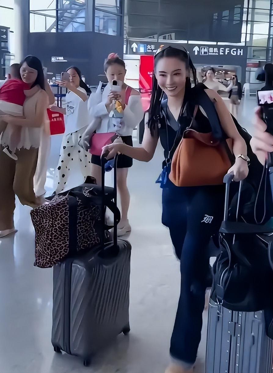 照片里,45岁的她推着两个大箱子,身上挂满了包包。