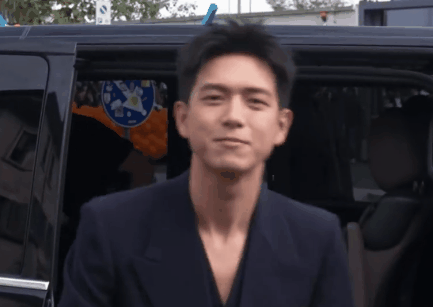 下车那一刻对着镜头挥手打招呼后,笑得如沐春风,清爽阳光。