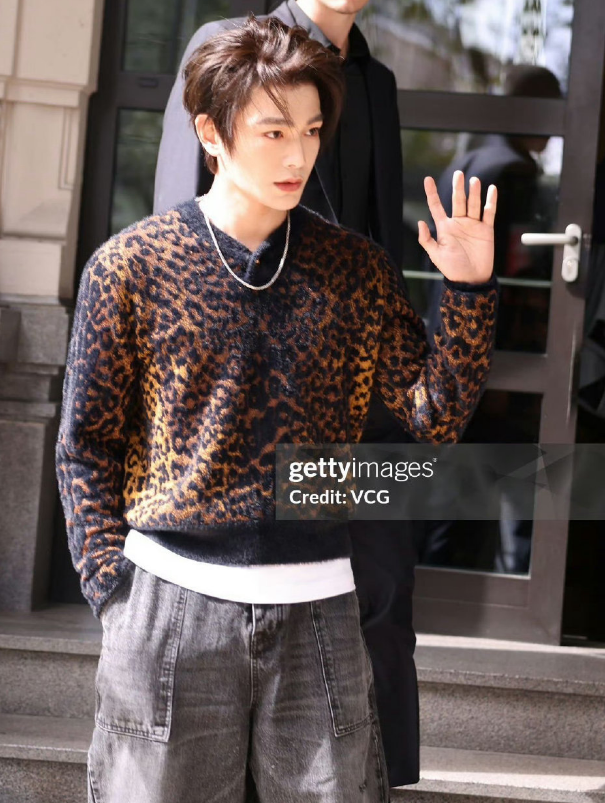 豹纹毛衣叠穿白色T恤,搭配灰色牛仔裤,潮流街头风,带有一丝野性与酷飒。