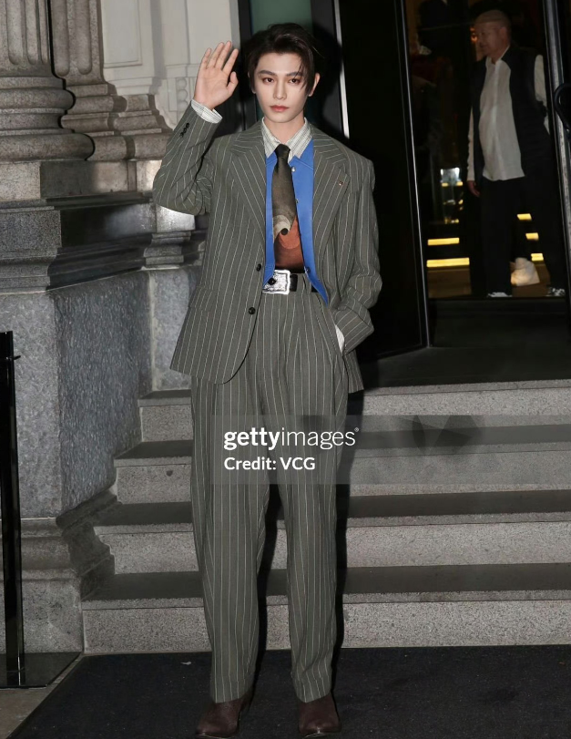 另一套灰色条纹西装,内搭克莱因蓝马甲,颇有个性,高腰西裤凸显优越的身材比例,复古造型穿出几分潇洒不羁。