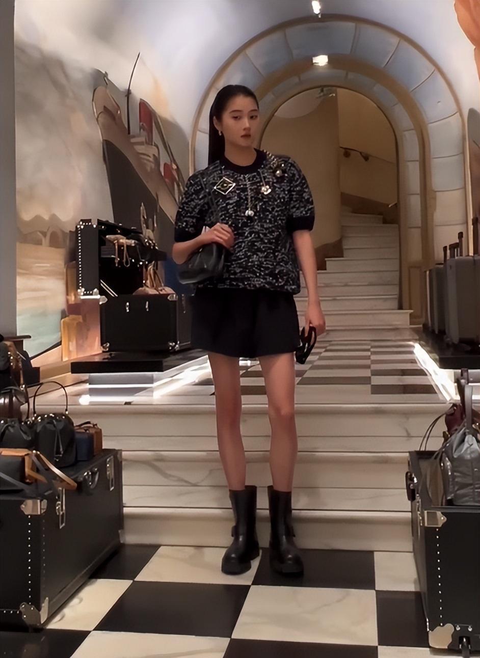 探店时黑白灰杂色毛衣,搭配黑色短裙,看得出是想突显优势,但这件毛衣未免太厚重了,莫名臃肿。