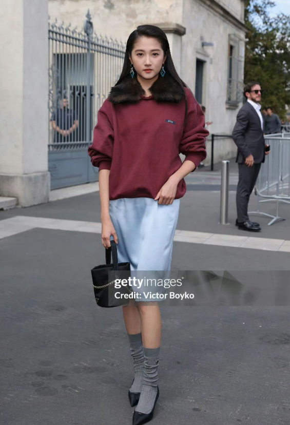 酒红色卫衣搭配绸缎质感的天蓝色半裙,长袜又遮住了一截小腿,视觉效果上完全是在缩短腿长。