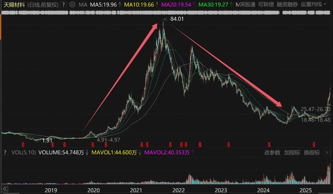 2020-2021年,全球新能源汽车爆发式增长,锂电材料价格暴涨,天赐材料股价从2020年初的4元多,暴涨到2021年最高的84元以上,不到两年暴涨超过20倍,市值一度突破1500亿元,可谓气势如虹、势不可挡。