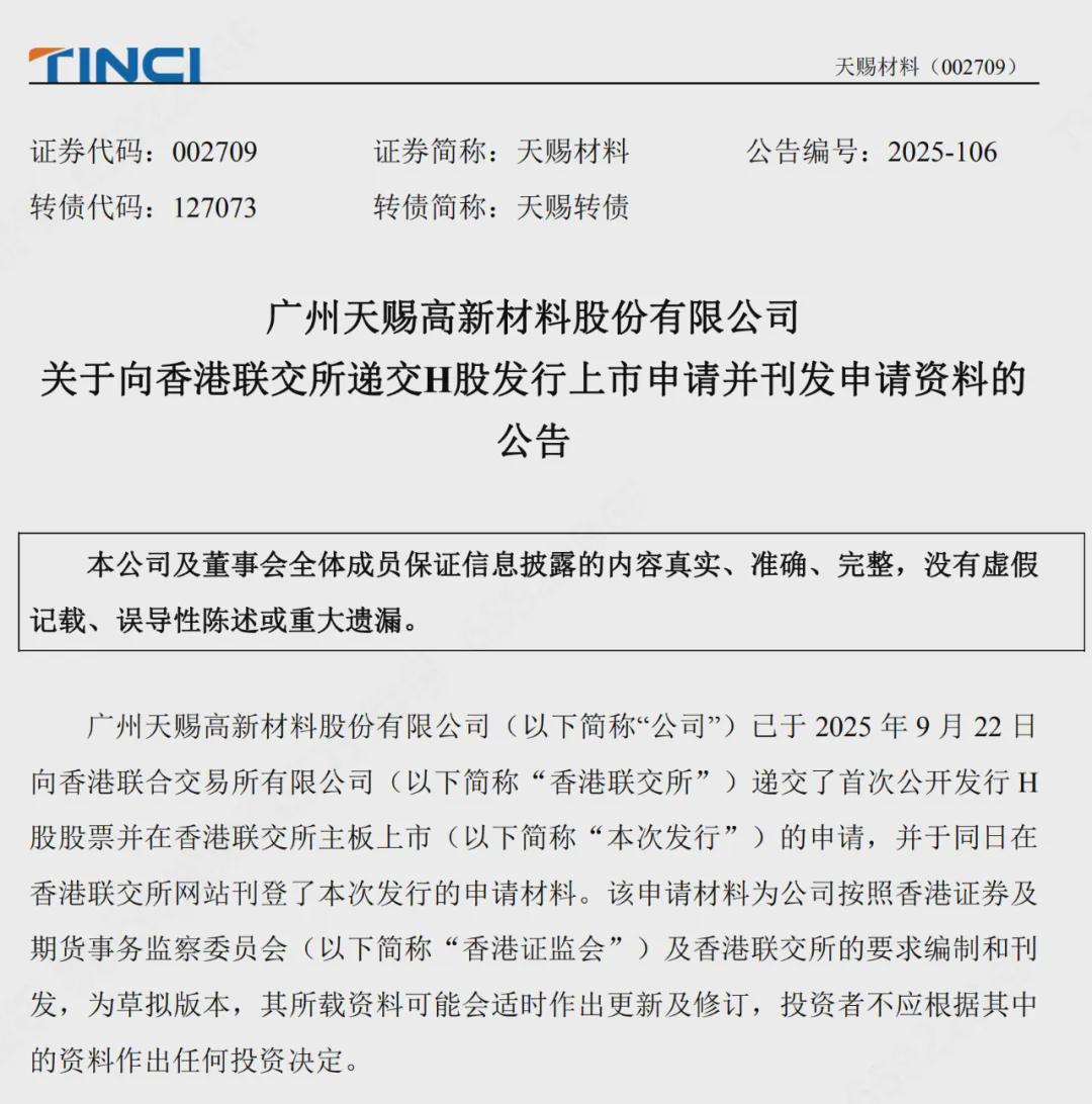 同样是在9月22日,天赐材料还发布一份更加重磅的公告,公司正式递交了H股上市的申请材料。
