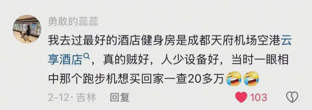 “感谢酒店健身,全了我在高压生活中崩溃的体面。”