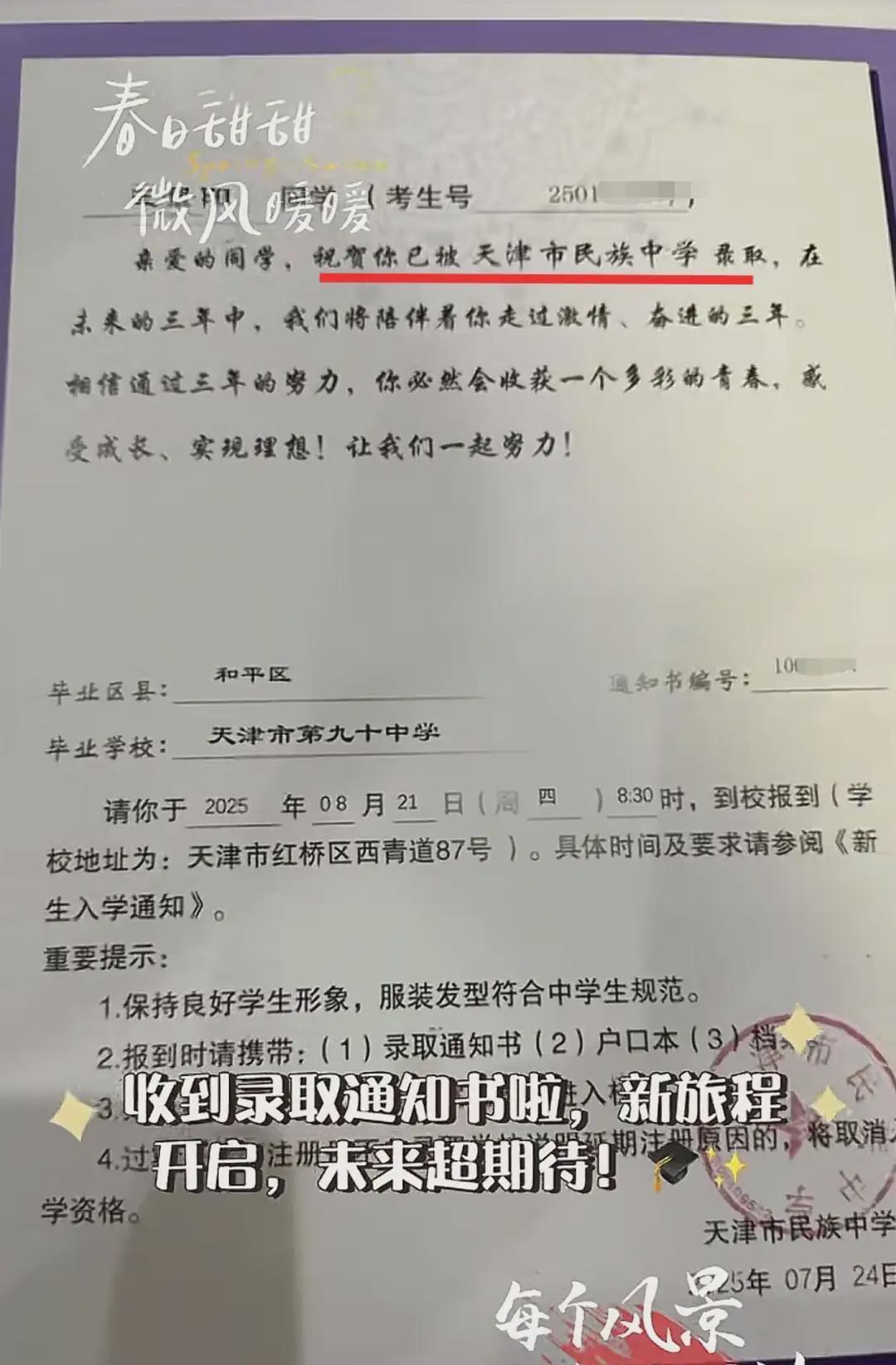 据家长发布的多个帖子显示,坠亡男孩王景阳身高185cm,2025年7月24日收到天津市民族中学录取通知书,原定8月21日入学,毕业于天津市第九十中学。这个中考成绩优异的男孩,在9月11日清晨笑着与父母道别后,永远停在了那个秋日的早晨。