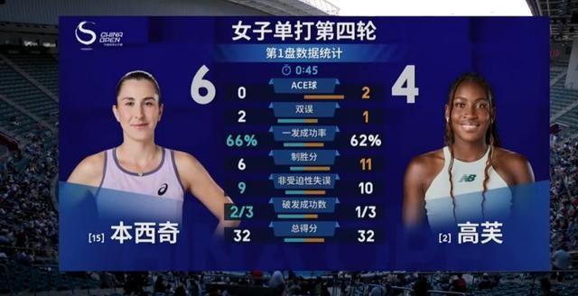 比赛伊始,高芙迅速进入状态,第4局完成破发后将比分拉开至4-1。然而本西奇并未放弃,她立即回破并保发成功,将比分追至4-4。关键的第9局,本西奇再次破发并拿下发球局,以6-4逆转赢得首盘胜利。整盘比赛耗时45分钟,双方都展现出极高的竞技水平。