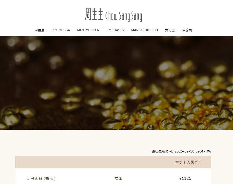 随着国际金价的飙升,国内金饰价格也紧跟其后,纷纷上调。据品牌官网消息,周生生足金饰品价格报1125元/克,较9月29日上涨了14元/克。周大福金饰克价也达到了1123元,较前一日上涨了15元/克。而老凤祥金饰克价则为1122元,同样呈现出上涨的趋势。