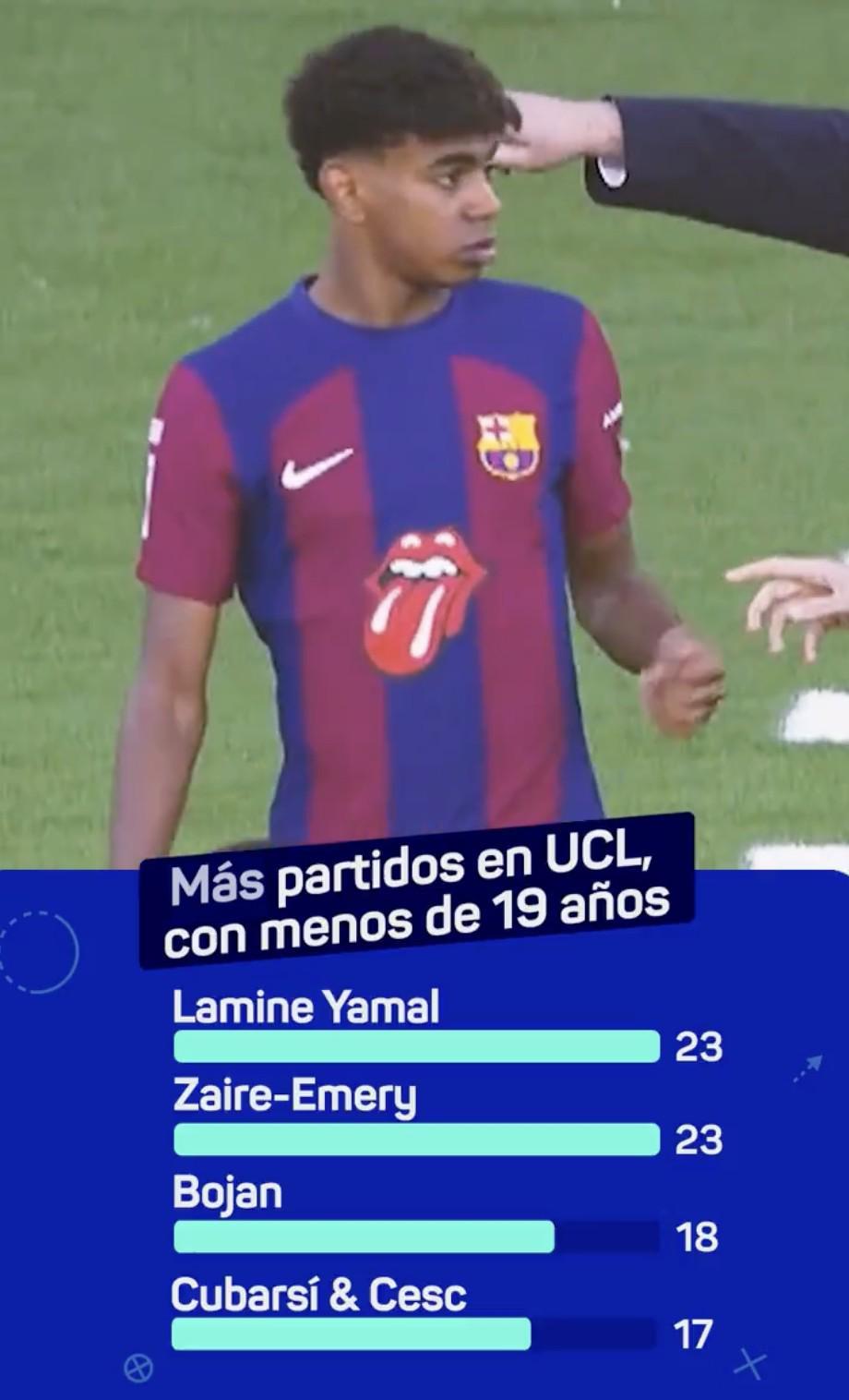 如果亚马尔能够在即将到来的对阵巴黎圣日耳曼的比赛中出场,那么他将凭借24场的欧冠出场次数,成功超越巴黎中场扎伊尔-埃梅里所保持的19岁前欧冠出场次数最多的纪录(23场),从而书写下属于自己的新篇章。