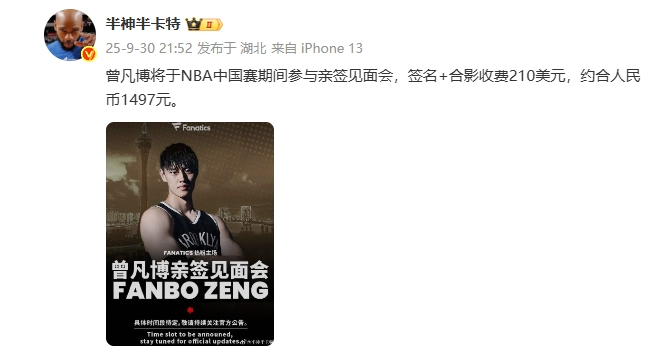 北京时间10月1日,据媒体人半神半卡特报道,中国篮球新星曾凡博将在NBA中国赛期间举办个人亲签见面会。此次活动中,粉丝若想与曾凡博进行签名合影,需支付210美元(折合人民币约1497元)。这一消息引发了广泛关注与讨论。