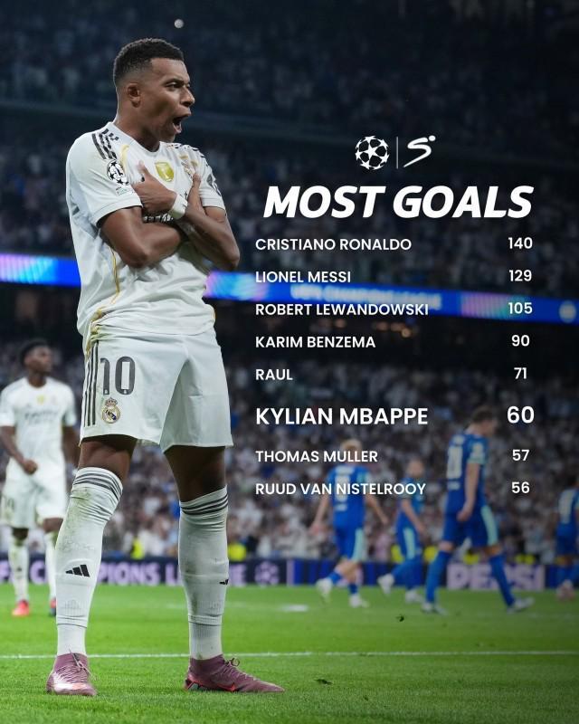 在这场比赛中,姆巴佩上演了帽子戏法,凭借这三个宝贵的进球,他成功跻身欧冠60球俱乐部,成为该俱乐部历史上的第六位成员。这一成就不仅彰显了姆巴佩的卓越实力,也让他在欧冠历史上留下了浓墨重彩的一笔。