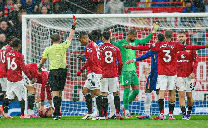 在曼联2-1战胜切尔西的英超联赛中,比赛第78分钟出现决定性判罚:切尔西门将桑切斯冲出禁区放倒曼联前锋姆伯莫,当值主裁直接出示红牌将其罚下。这一判罚引发了关于动作性质和量刑标准的广泛讨论。