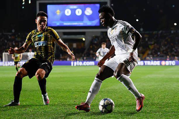 开场后,皇马并未展现出身价百倍碾压对手的气势。前15分钟,除维尼修斯错失单刀外,球队几乎毫无机会;反倒是凯拉特借主场之势完成几次射门。凯拉特能在欧冠资格赛附加赛两回合零封凯尔特人,证明其防守具备一定水准。整个上半场,进攻线主力尽出的皇马仅制造出少量破门机会,若非凯拉特门将扑倒马斯坦托诺送点,皇马恐难在中场休息前打破僵局。