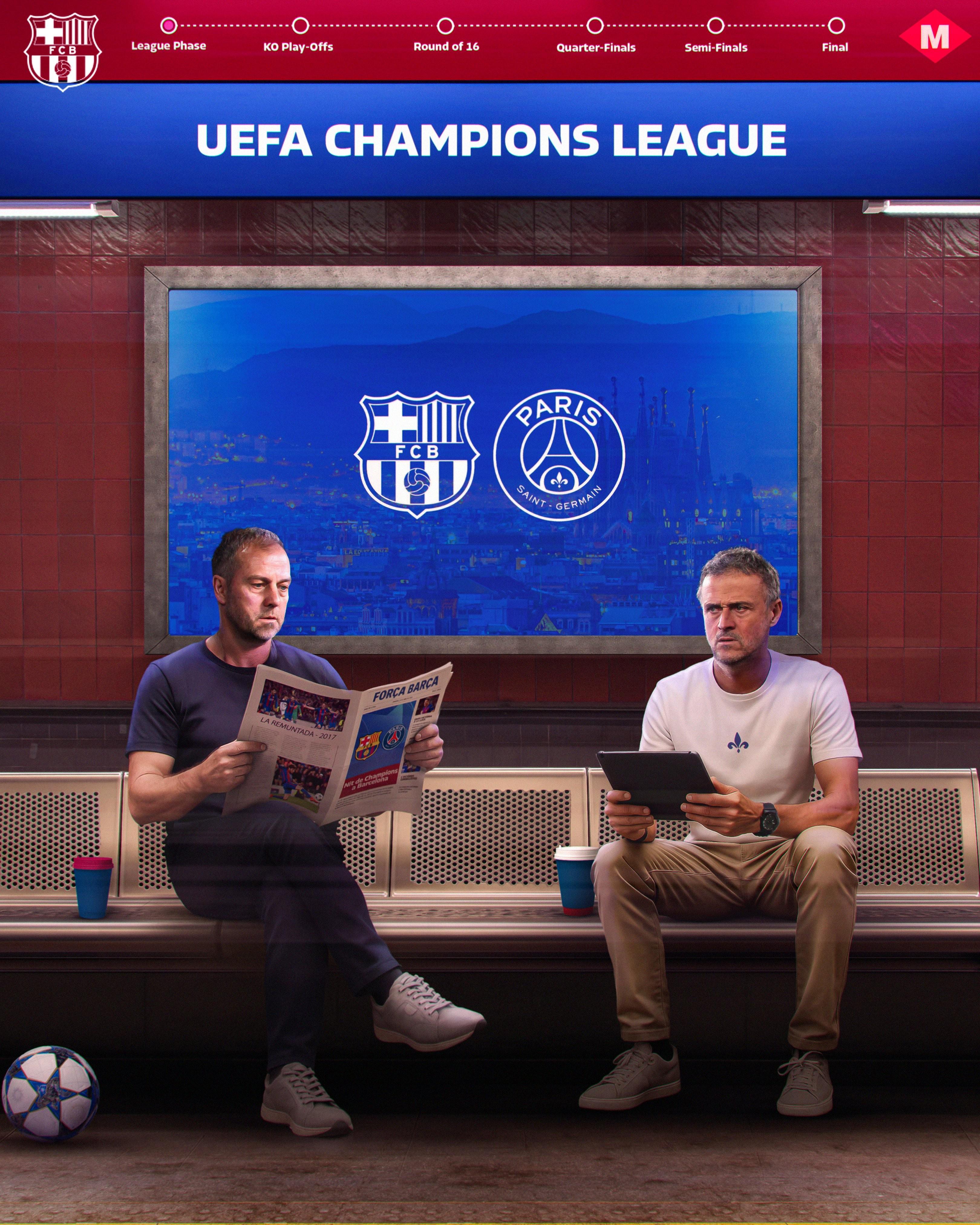 在这张精心设计的海报中,巴萨现任主帅弗里克与巴黎圣日耳曼主帅恩里克成为了画面的主角。两位主帅并肩坐在长椅上,仿佛在等待着列车的到来,这一场景既富有象征意义,又充满了悬念。