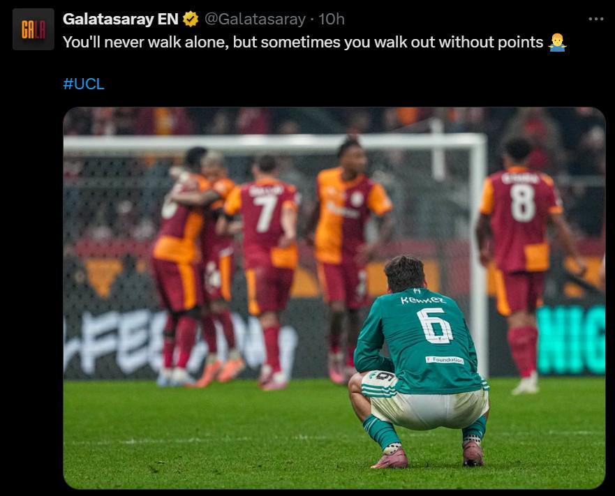 紧接着,加拉塔萨雷又玩起了文字游戏,戏仿利物浦的经典队歌“你永远不会独行”(You'll Never Walk Alone),改写为:“你永远不会独行,但有时你会空手而归。”这一改写迅速在网络上引发了热议,不少球迷纷纷表示,加拉塔萨雷的这次“补刀”实在是太狠了。